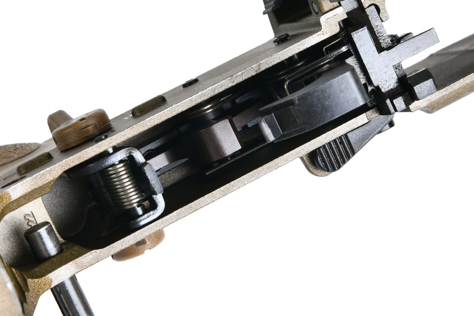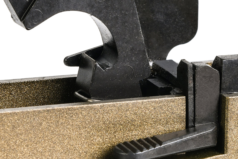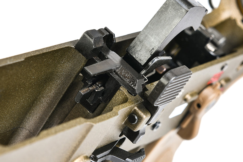 Незначні конструктивні зміни в нижній частині ствольної коробки A5 підвищують загальну надійність та зручність використання як правою, так і правою рукою. Подвійні запобіжники/селектори, кнопки спуску магазина та кнопки спуску затвора розташовані з обох боків нижньої частини ствольної коробки HK416 A5.