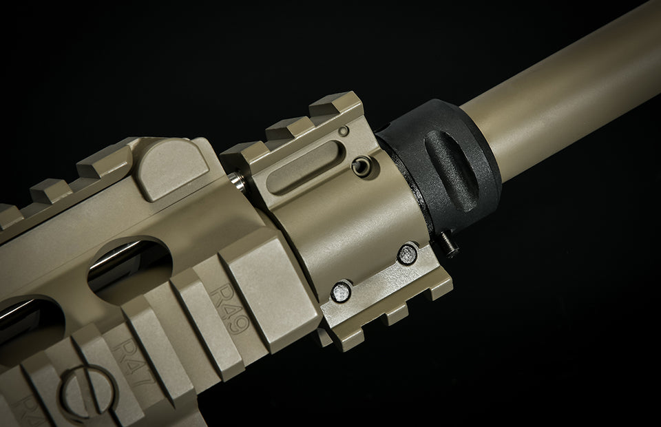 Ця вільна плаваюча цівка має вбудовану відкидну мушку, яка складається врівень із суцільною верхньою планкою, коли не використовується. Повне глибоке гравіювання та довжина mil-spec M1913 Picatinny rails розташовані в чотирьох положеннях, сумісні з тактичними аксесуарами на рейках.